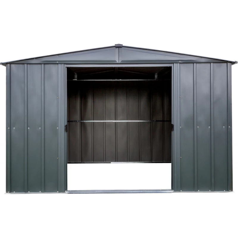 Ces panneaux qui constituent les parois et la toiture ne nécessitent aucun entretien, et leur coloris gris anthracite s’intègrera discrètement et harmonieusement dans tout type d’aménagement extérieur. L’abri dispose d’une très large double porte coulissante, qui parcourt toute la façade, très pratique pour le transport d’objets volumineux, et la porte est verrouillable (cadenas non inclus). La toiture peut supporter une charge de neige de 100kg/m², sa construction à double pente garantit une évacuation efficace de l’eau vers l’arrière de l’abri et facilite le déblayage de la neige.