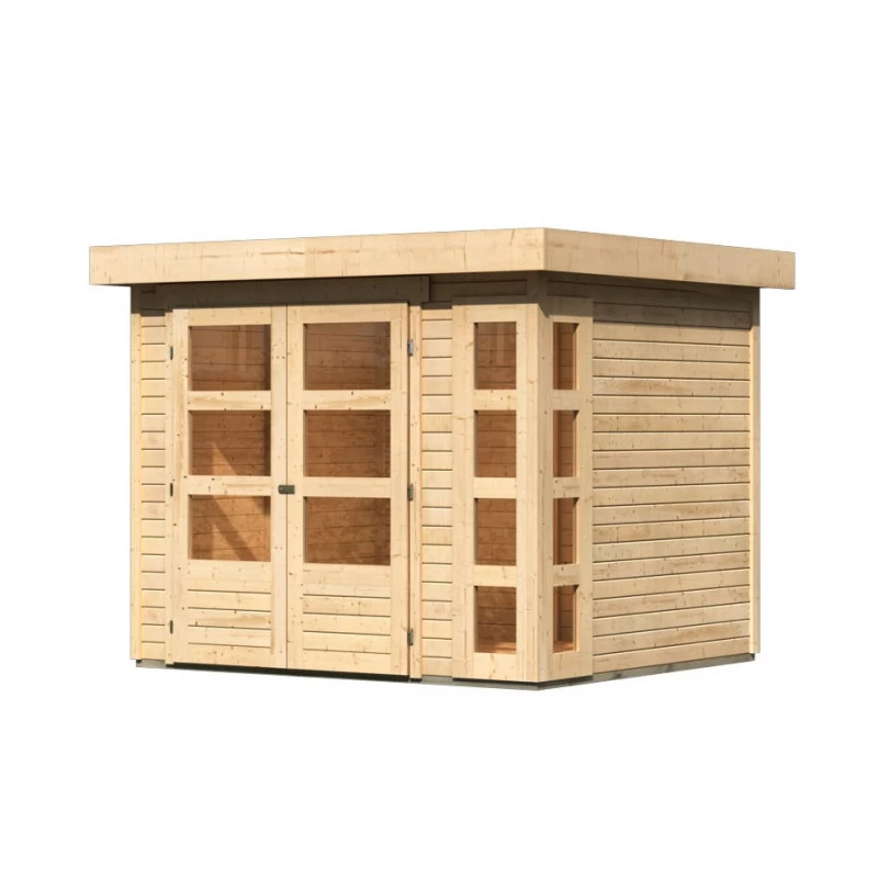 Le toit, également en bois massif, est couvert du feutre bitumé. Pour obtenir une meilleure étanchéité de votre abri de jardin en bois 5,25m² Kerko 3, il est conseillé de mettre une couverture autoadhésive disponible en option.