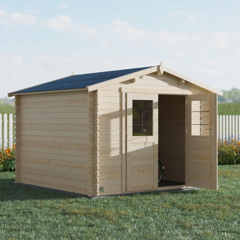 L’abri de jardin en bois massif 8,9m² Volta possède un toit double pente avec le feutre bitumé comme couverture initiale. Les deux grilles de ventilation et la visserie en acier inoxydable sont également incluses comme preuve d’une finition de qualité.