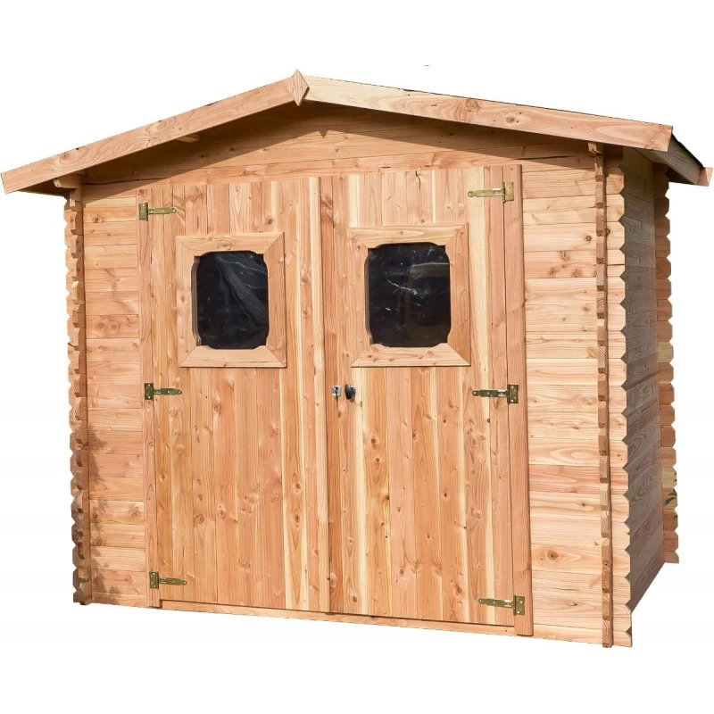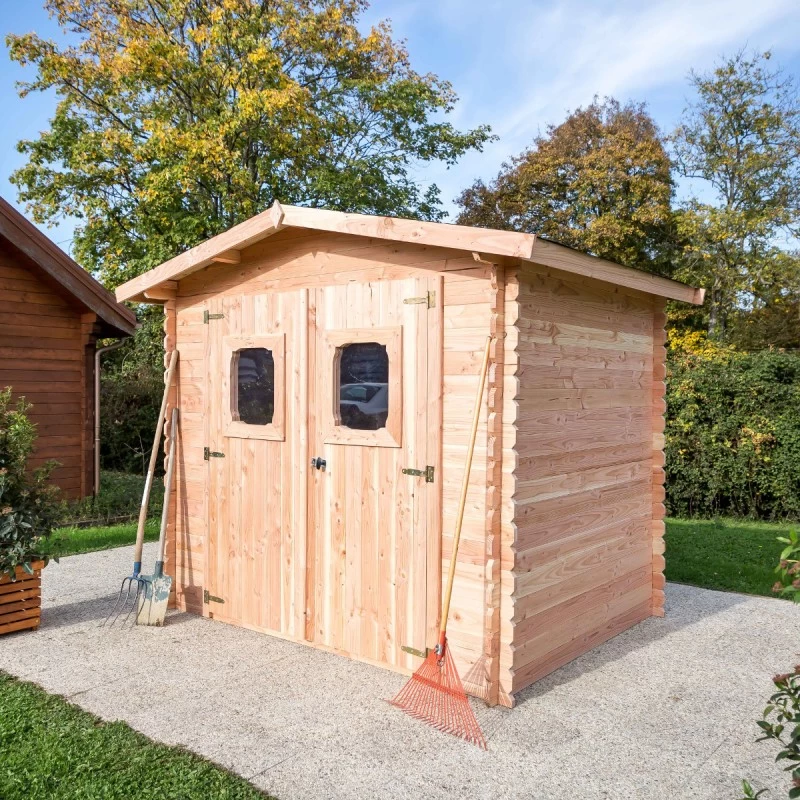 • Abri en bois de belle finition aspect brun-rosé, naturellement durable ne nécessitant pas de traitement chimique