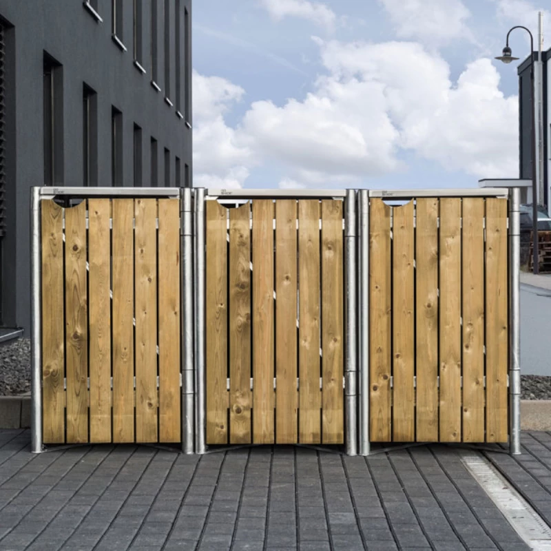 Avec ses 3 compartiments, le cache-poubelle Hide vous permettra de pratiquer un tri sélectif en un simple geste. Réalisé avec des matériaux de première qualité, ce cache-poubelle accueille 3 conteneurs à déchets d’un volume de 240L chacun. Le cadre est en acier galvanisé à chaud et les parois sont planchettes de pin traité, pour une durabilité et une solidité inégalées. Le pin a subi un traitement par imprégnation, contre les moisissures et les insectes xylophages. Le bois utilisé est certifié PEFC et provient de forêts gérées de façon responsable et dans le respect de l’environnement.