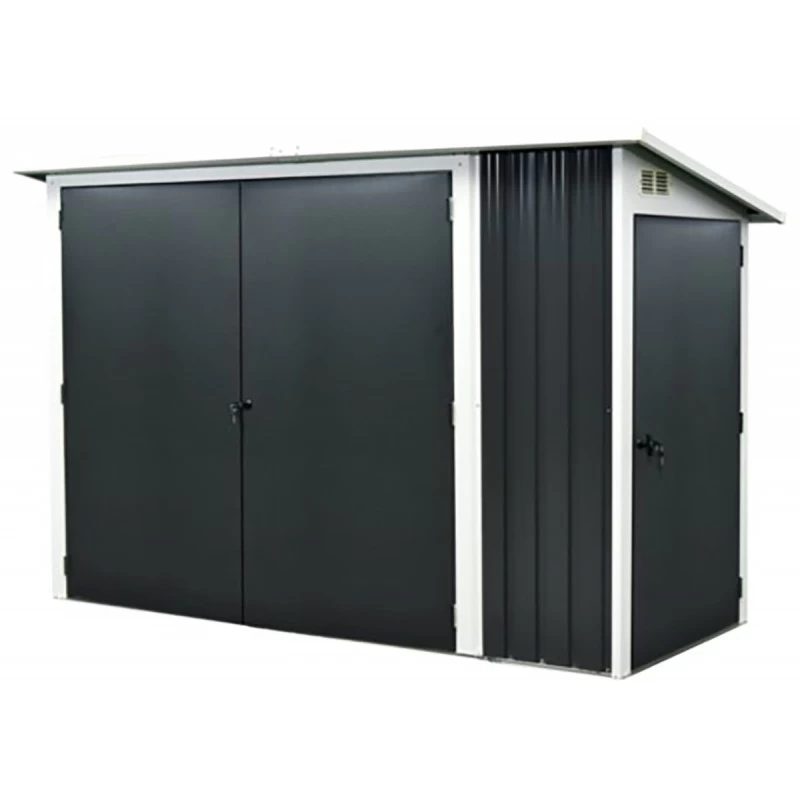 Cet abri de rangement en acier galvanisé gris anthracite vous permettra d’entreposer du matériel de jardinage encombrant ou pourra vous servir de garage à vélos. Il est muni d’une large double porte en façade pour un accès pratique et confortable, ainsi que d’une qui sera utile pour sortir votre vélo tous les jours sans devoir ouvrir la double porte.