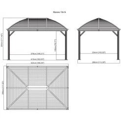 Chaque côté du pavillon comprend une double porte moustiquaire coulissante, de dimensions 140x210cm pour les largeurs et 205x210cm pour les longueurs. L’emprise de la toiture est de 362x427cm avec une hauteur faîtière de 296cm. Grâce à la toiture en polycarbonate de 8mm d’épaisseur, vous pourrez cultiver des plantes sensibles et profiter des rayons du soleil pour vous réchauffer aux entre saisons. Et lorsque le soleil est trop fort, un store rétractable vous assurera un ombrage rafraichissant. Le store se compose de 2 parties qui se joignent à la main au moyen d’un clip, en toute simplicité. Le montage doit se faire sur une surface plane, il se réalise facilement au moyen d’un outillage standard à 2 personnes en environ 5 à 6 heures.