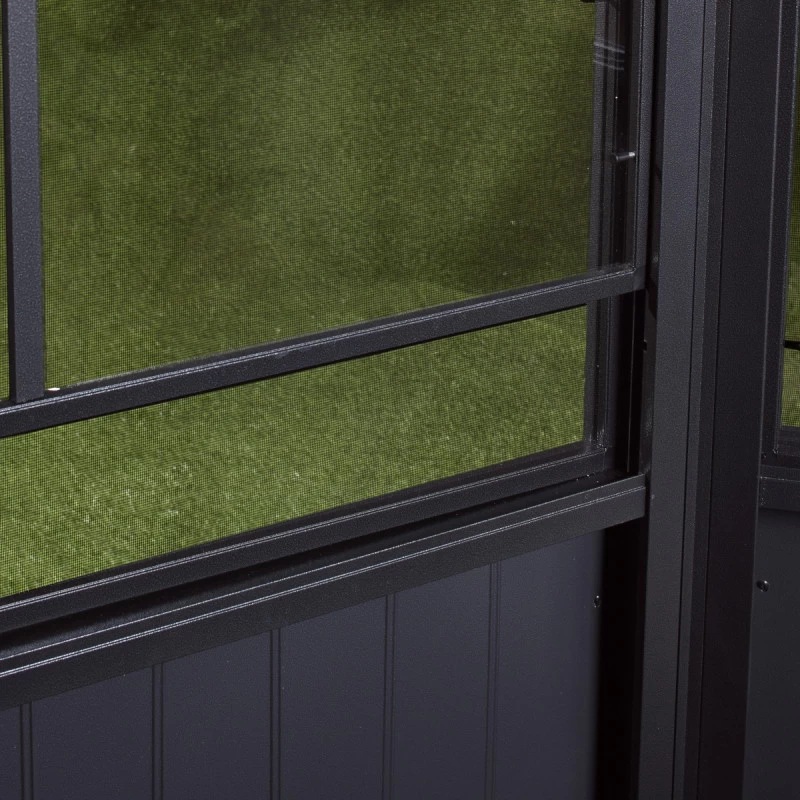 Le vitrage des fenêtres est en Mica, un film PVC ultra-résistant à la déchirure et déformable qui offre une excellente transparence. Les fenêtres à guillotine sont des fenêtres coulissant verticalement qui peuvent être ouvertes soit en partie basse, soit en partie haute pour apporter une ventilation optimale. Chaque panneau de fenêtre est livré avec une moustiquaire sur cadre rigide. Fenêtres et moustiquaires peuvent être retirées en toute facilité en débloquant les loquets qui les maintiennent en place, ce qui est très pratique pour leur entretien.