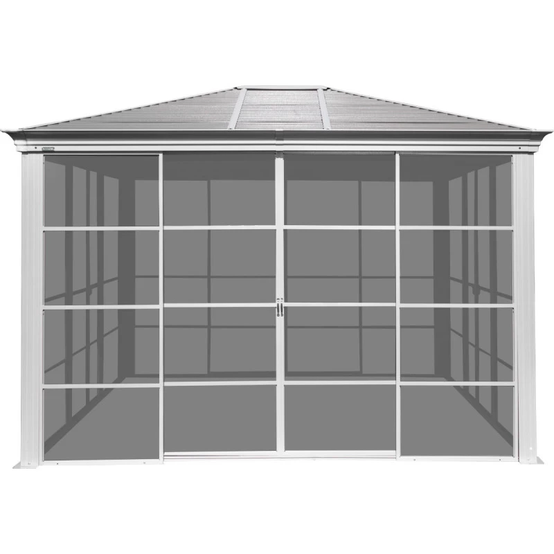 Le pavillon Striano possède des parois constituées de cadres en aluminium sur lesquels sont tendues des moustiquaires, pour une protection optimale contre les insectes nuisibles. Chaque paroi est munie d’une double porte moustiquaire coulissante de dimensions 100x210cm pour les largeurs et 165x210cm pour les longueurs. La structure en aluminium est thermo laquée, et se compose de 4 poteaux robustes de 76mm de côtés qui soutiennent la toiture en acier galvanisé à l’agencement horizontal.