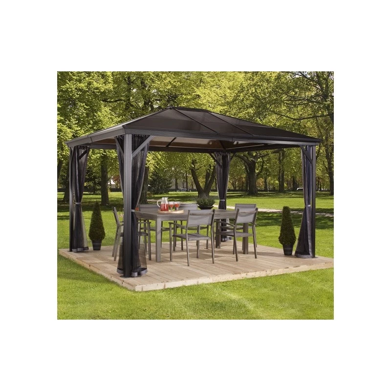 Pour vous assurer une bonne protection contre la pluie et le vent, ce solide gazebo de 12,57m² Sojag est pourvue de deux rails et d’une moustiquaire en nylon. Les parois de côté adaptées sont également disponibles en option pour fermer complètement la pergola.