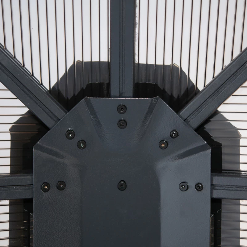 La toiture est constituée de panneaux solides en polycarbonate à doubles parois de 8mm d’épaisseur teintés gris. Ces panneaux résistent au rayonnement UV et sont parfaitement hermétiques. Ils sont conçus pour supporter une charge de neige de 125kg/m² ce qui vous dispensera de démonter le gazebo pendant la saison hivernale. L’installation est aisée, avec un outillage basique, et se réalise à deux personnes en environ 4 à 5 heures sur sol plat.